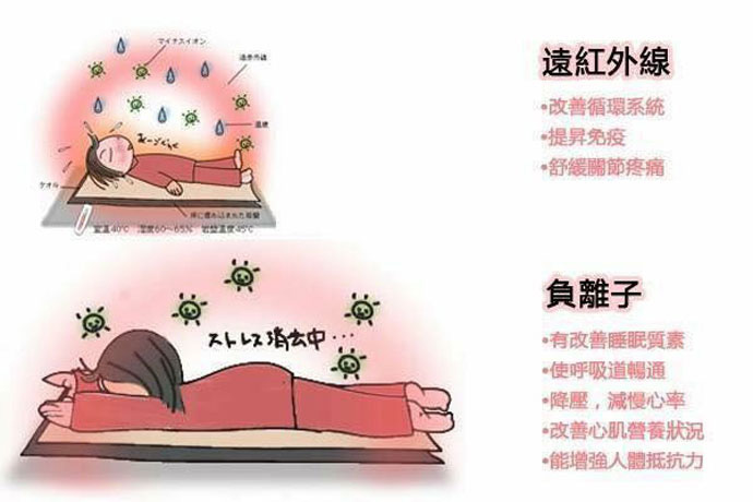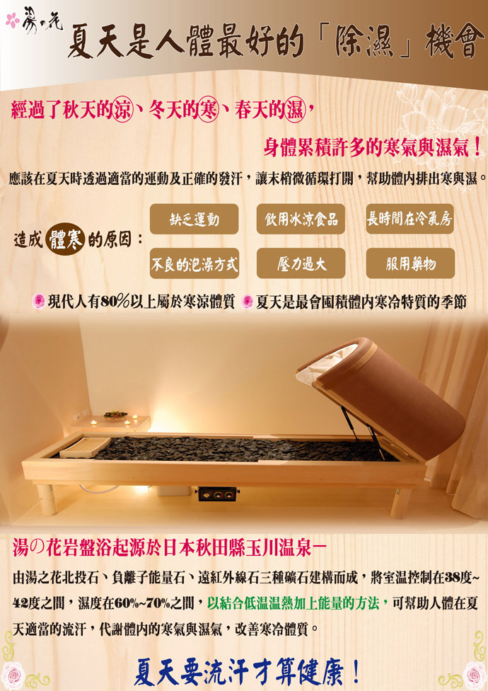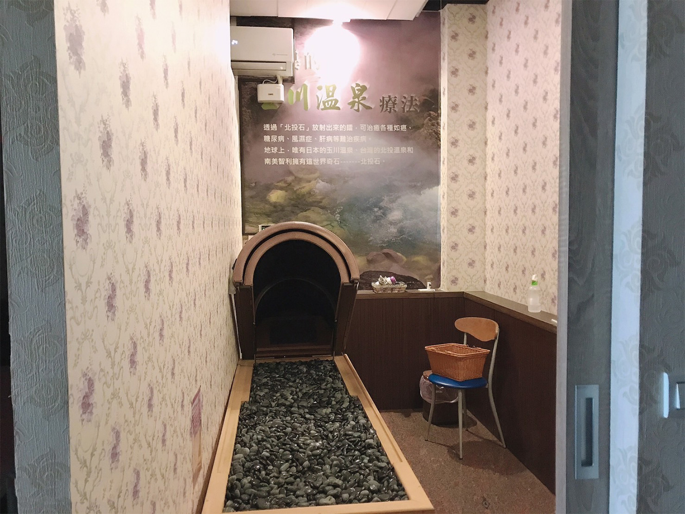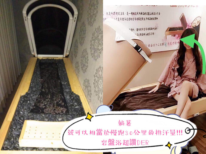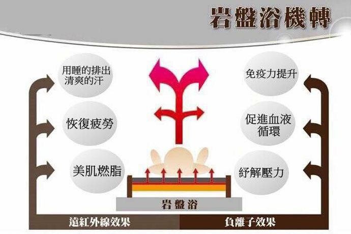 重資引進日本原裝進口~乾式溫泉{岩盤浴},萃取日本溫泉沉澱物做成的北投石,含有微量元素“ 鐳”,利用溫泉產生的地熱,結合能量釋放,滲透身體深處達到爆汗除濕、紓解全身痠痛,淡化色素、緊緻肌膚等功能。